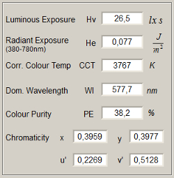 Pulsed sources are often point like sources and therefore they will be measured with a luxmeter or with regard to specbos in illuminance mode using the diffusor cap. Monitors are measured in luminance mode. specbos 2501 measures the cycletime of a pulsed source with an additional detector in the front face. The spectral measurement will be synchronized with the measured source cycle. Radiometric and photometric values are indicated in exposure per puls (H).