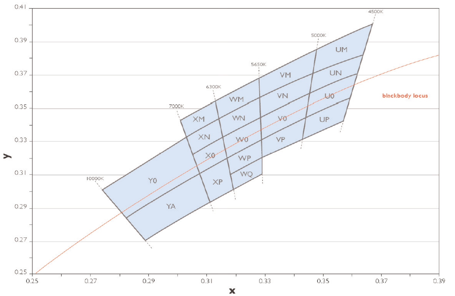 xy diagram with different ranks of a white LED