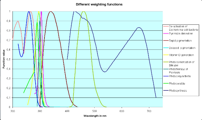 Other photobiological weighting functions are listed in the following table and in the diagram [1]: