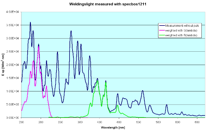 The following figures show the measurement of a welding arc with a specbos 2501-UV as well as the result (radiometric as well as weighted by the S(λ) and B(λ) curves).