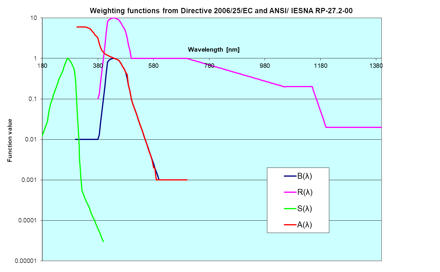 The figure shows the three weighting functions S(λ), B(λ) and R(λ), additionally the aphatic (lenseless) A(λ) function, which is only included in the US document ANSI/ IESNA RP-27.2-00.