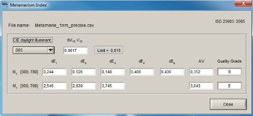 This is a first criterion of the match between the standard illuminant and the real one.The color differences dE for all 8 pairs are given. The averages for both versions are the metameric indeces Mv and Mu.
