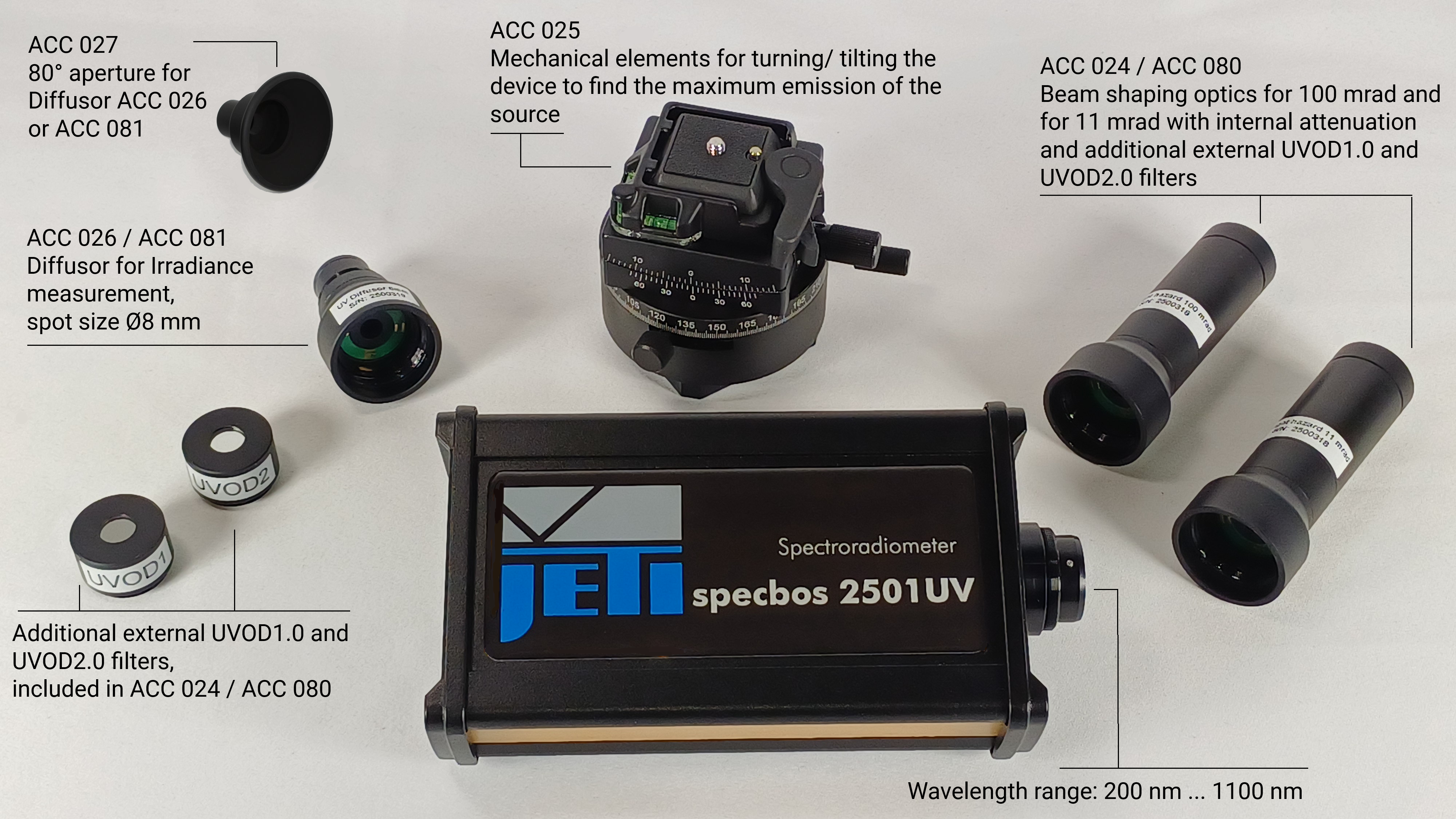 | Irradiance | Eye UVA, Actinic UV, Eye IR, Skin thermal | 80° aperture for Diffusor ACC 026 or ACC 081 | ACC 027 (specbos 1211-UV-2 & specbos 2511-UV / specbos 2501-UV) |