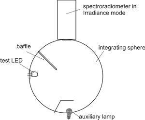 If a goniometric scan is too slow and only integral values are of interest (e.g. in production), the measurements can be done with an Integrating sphere. This sphere contains at least two ports – one for the sample and one for the probe. A baffle is needed to avoid direct incidence of the sample light to the probe. The probe is calibrated for Radiant flux, but basically measures the Illuminance in the plane of the inner sphere surface. The sphere needs to fulfil the following requirements to guarantee an almost equal illuminance on all surface parts (that the illuminance at the measuring location is representative for the whole sphere wall):