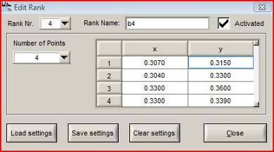 The measurements can be done in Luminous intensity mode (specbos 1411) or in Luminous flux mode (specbos 1311). It is possible to define up to 12 user specific xy ranks and store them into a file. The ranks consist of polygons with up to 9 corners.