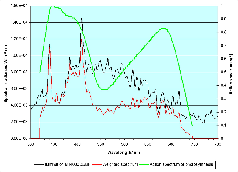 A typical application of such measurements is the characterization of the illuminance in green houses. The plants react different on different illumination spectra and the aim of research is to find the best lighting conditions for the growing of the plant. Due to very different white spectra created by different lamp technologies the weighted values may be quite different although the radiometric values are equal.