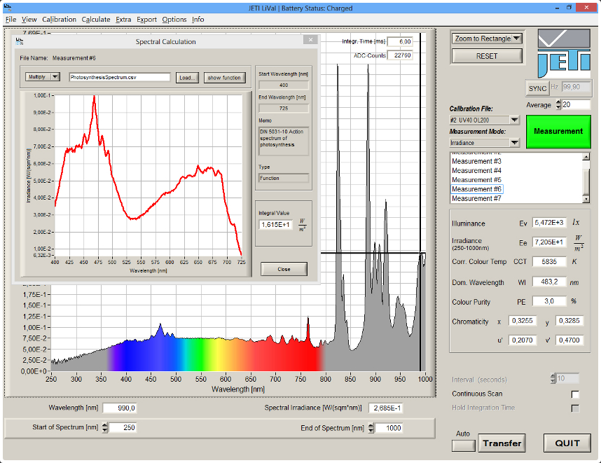 If the weighting function range from 0 to 1, this mean that the effectivity can vary between 0 and 100%. In this case the weighted spectrum has the same unit as the non weighted illumination spectrum. The spectroradiometer specbos 2501 can be used for the measurement of such weighted values. The software JETI LiVal contains the special menu point Spectral calculations which allows to read a weighting function and to proceed the spectral and integral calculation.