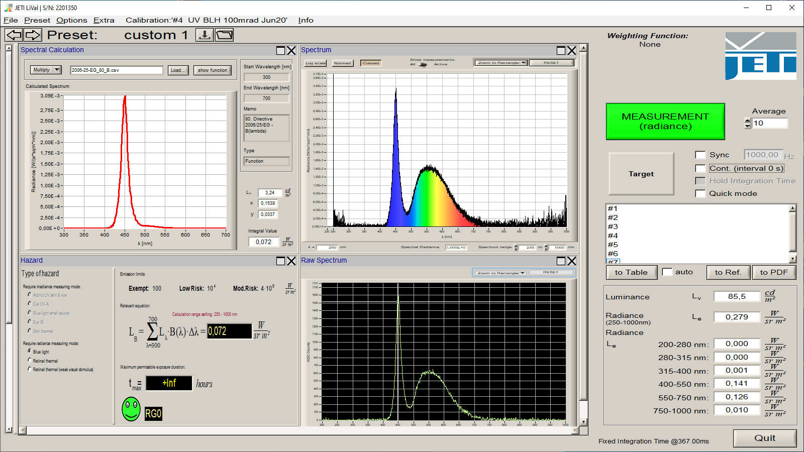 S(λ) UV Hazard Weighting FunctionThe software JETI LiVal includes the Hazard measurements in a special calculation window. It shows the limits of the different groups for the selected category, calculates the final measuring value and shows the classification into the risk groups.