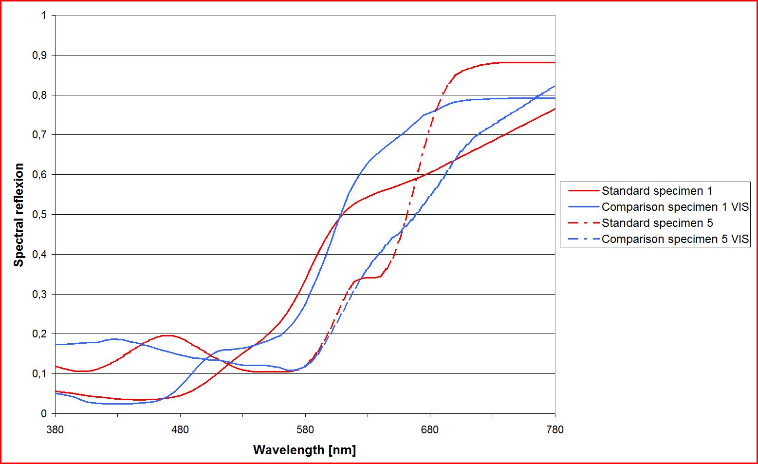 There were defined 5 specimen pairs for characterization of the pure visible reflexion (calculation of Mv) and additionally 3 pairs with inclusion of fluoerscence properties (Mu). All comparison specimens were defined for 4 different reference spectra (D50, D55, D65, D75). The following diagram shows two pairs for the calculation of the visible metameric index.