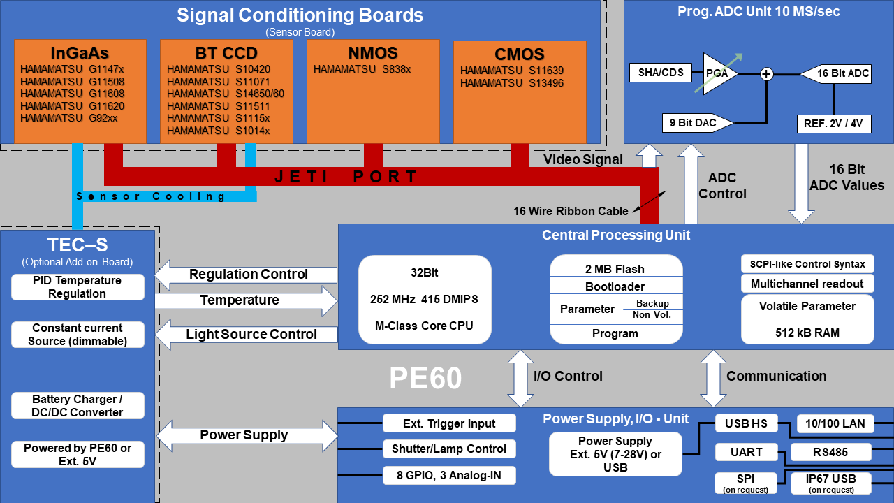 The PE60_2 line array readout electronics is a versatile powerful 32 bit RISC processor based operation solution for spectrometers. It is especially suited for process control applications. It can control most of the popular spectroscopy image sensors with JETI's wide range of available signal conditioning boards. Optional onboard Ethernet and 7-28V external supply range enable easy integration in industrial applications. It is stackable with add-on TEC-S electronics for precise temperature regulation of image sensors equipped with Peltier element..